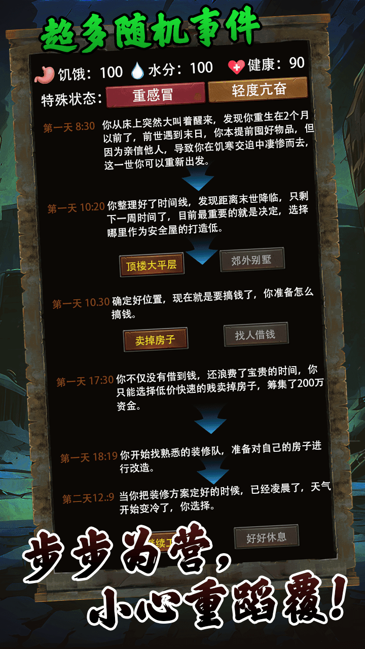 ,末日你将体验到末日生存的安全真实感;通过随机事件和选项,增强了游戏的末日